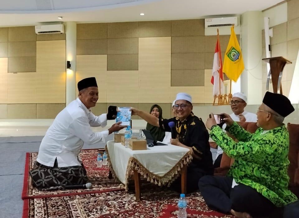 Gus Salam YS memberikan satu karya bukunya kepada Sekretaris Umum DMI Kota Tangerang, Dr Akhmad Suja’i MM, seusai kajian di Gedung MUI Kota Tangerang, Minggu (12/10/2025). Foto by AHQ Center Indonesia.